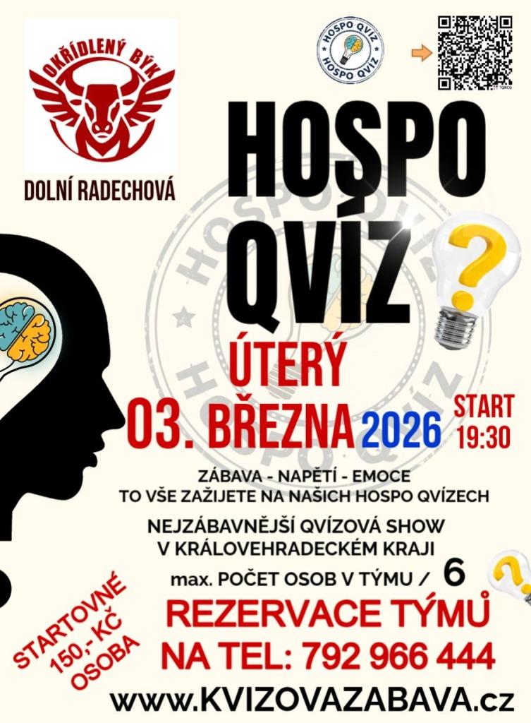 Zveme vás na další Hospodský Qvíz do Okřídleného býka v Dolní Radechové. Akce je určena pro týmy o 3 až 6 hráčích, kde se utká maximálně 6 týmů. Přihlaste se s názvem týmu a počtem hráčů buď v komentářích na Facebooku, nebo telefonicky. Nezapomeňte, že kapacita je omezena, proto neváhejte a zajistěte si místo co nejdříve. Těšíme se na vaši účast a skvělou zábavu.